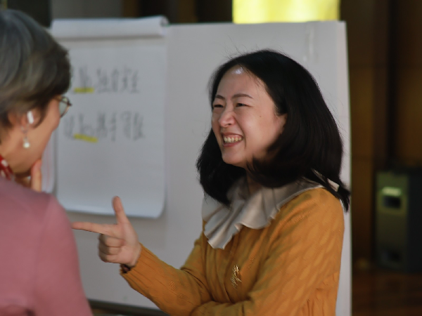 在即兴戏剧培训师的引导下,参加活动的老师们在破冰环节已沉浸在“即兴创意”带来的惊喜和欢乐之中。“即兴戏剧”活动的内核是“SAY YES”,老师们跟着培训师的示范讲解,随机两人一组,互动体验了三种不同的沟通方式:“No,because”、“Yes,but”、“Yes,and”,通过分享不同沟通方式带来的感受,大家更深体会到团队协作中彼此支持的重要性。接下来的体验环节都基于“Yes,and”的共识,分小组的“即兴故事接龙”和“拍手叫停舞台剧”,大家脑洞大开,收获了很多思维碰撞产生的创意、意外惊喜,以及团队成员间彼此的信任、接纳和协作。