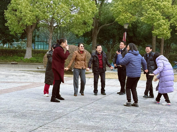 互动项目将活动推向高潮。“桃花朵朵开”考验馆员们的反应能力与团队协作意识,大家根据指令迅速抱团,配合默契,展现出高效的集体行动力;趣味踢毽子环节节奏舒缓、轻松愉快,馆员们各展所长,欢声笑语不断,压力与疲惫在这一刻得到充分释放;而“爱的魔力转圈圈”则将团队协作精神发挥到极致,组员们相互扶持、齐心协力,充分展现了图书馆馆员团结一心、奋勇争先的良好风貌。